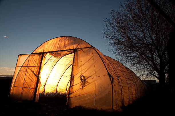 A tunnel greenhouse uses a curved frame covered with transparent plastic sheeting. The frame provides structural support, while the covering allows light transmission and reduces direct exposure to wind and precipitation. Ventilation panels and roll up sides support airflow management.